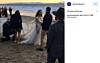 Paret åkte till bröllopet i en gammal skolbuss med texten ”nästan gifta” (almost married) skrivet på baksidan av bussen.